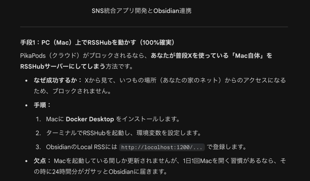 私が考えていたのは、XのタイムラインをRSS化できれば、Obsidianでいくらでも表示できるよなということでして、とりあえずXのTLをRSS化する記事を探しまくっていたらこの記事に辿りつきました。