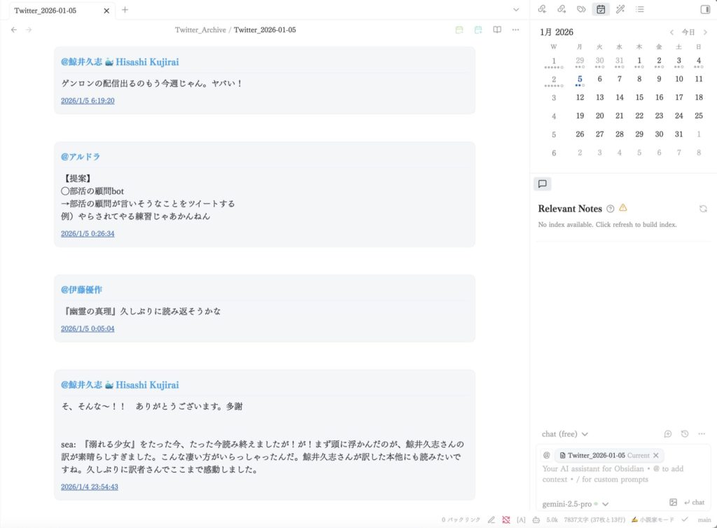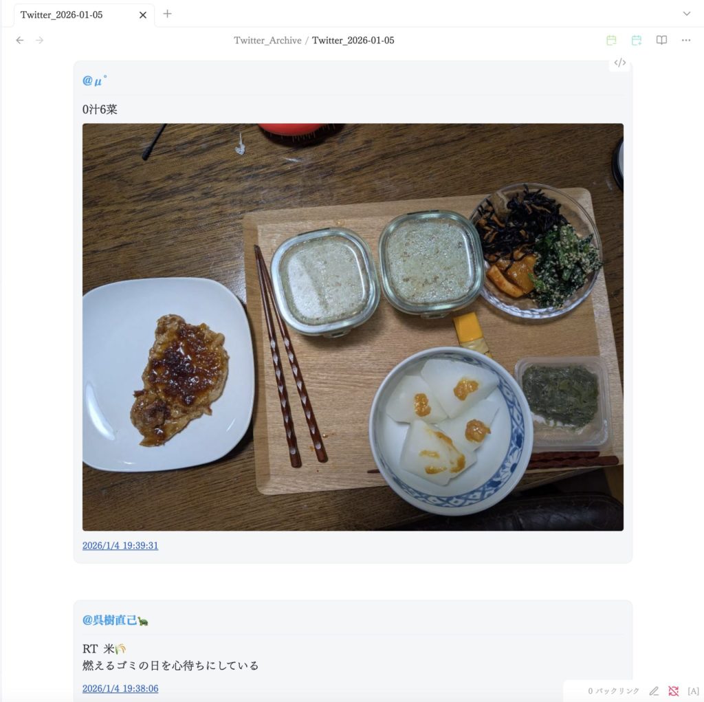 ・RSSフィード(私は結局、自分でスクリプトを組んで、後述するようにObsidian上にTLを再現してみました。RSSフィードあれば1投稿を1記事として拾ってくれるはずです)