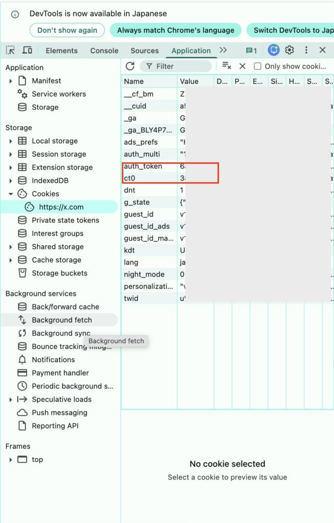 トークンというのは、Chromeなどで自分のXアカウントを開き、そのページでデベロッパーツールを開けばわかります。