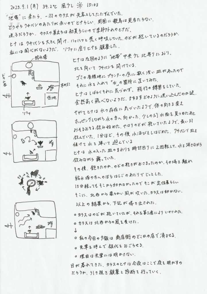 心臓がうるさい。落ち着いてなどいられるわけがない。だがやることは一つだ。私は再びカラスを観察する。カラスのヒナは、私の姿を認め先ほどからそわそわとしている。ノートの続きには「カラスが水をもらえると学習している」とあった。やはりというか何というか、カラスは皿の方へ寄っていって、こちらをじっと見つめてきた。完全に、皿と水を等式で結びつけているようだった。そして、私(ともうひとり)はヒナにとって警戒すべきではない対象として認められているのだった。それは、正直なところ満更でもない。
