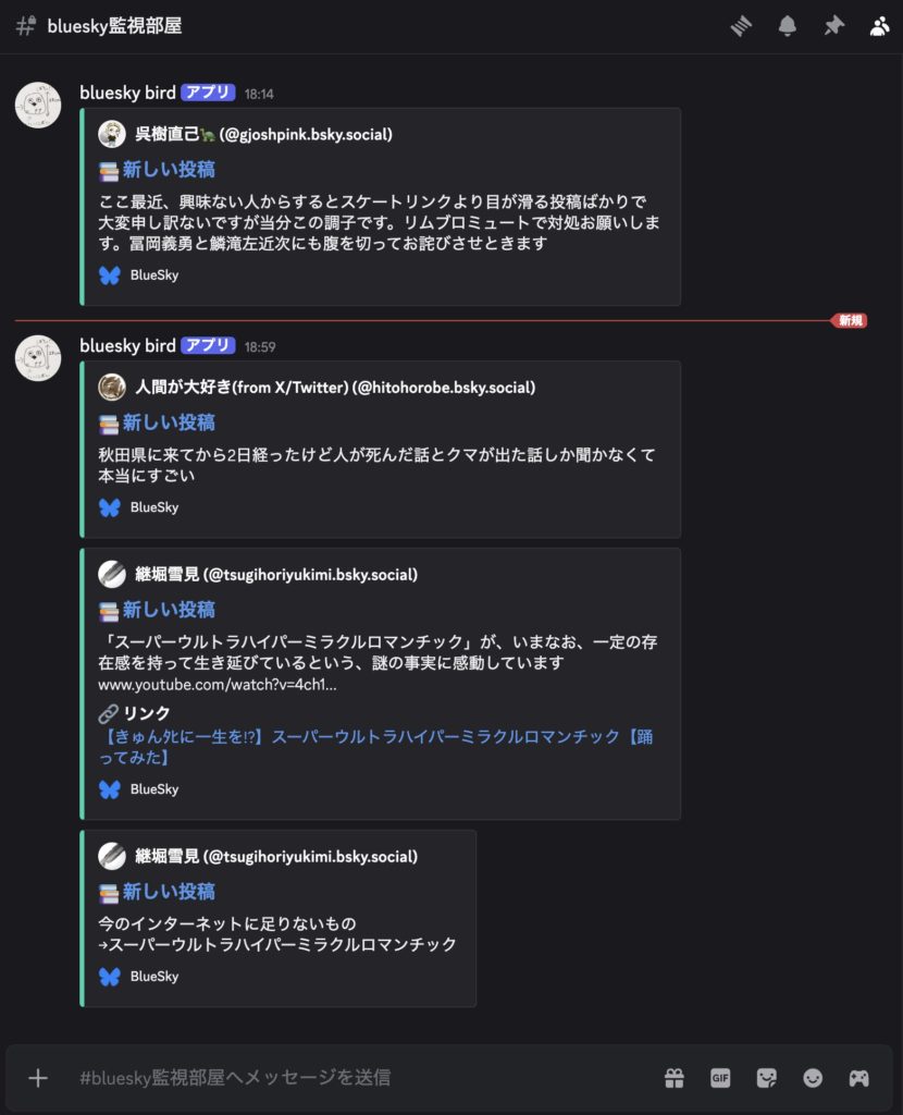しかしやはり困る面もあり、たとえばBlueskyに移行された悪漢と密偵さんの投稿はいつも新刊情報の参考にさせていただいているので、色々考えた結果、API経由でdiscordに特定のBlueskyアカウントの投稿だけ流すことにしました。